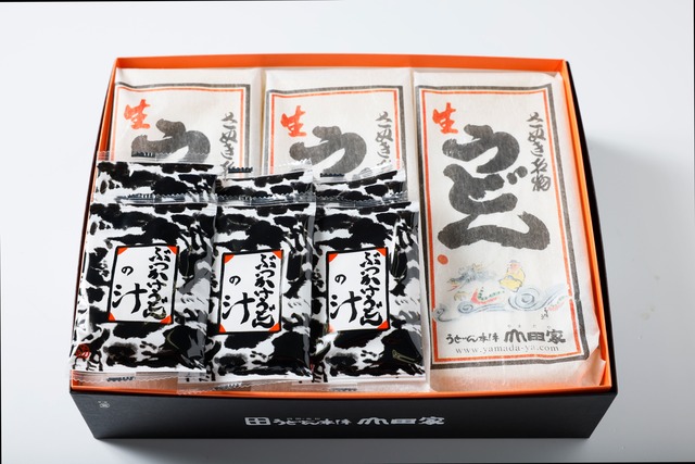 あの、のどごしをご家庭でも。 山田家を持ち帰る、山田家自慢の純生讃岐うどん。 山田家が製粉メーカーと共同開発した専用の小麦粉と酒処ならではの良質の水を使用。乾燥うどんや半生うどんでは味わえないもっちり感と小麦の香りが特徴。 純生讃岐うどんは、山田家名物の「釜ぶっかけ」をはじめ、かけうどんやざるうどんでも楽しめる味。 大切な方への贈り物にも好適です。 《うどん本陣山田家》 江戸時代より続く登録有形文化財の元酒造家の屋敷を改装し、昭和53年に讃岐うどん店として創業した「うどん本陣山田家」。 讃岐伝統の技で鍛え、手打ちで仕上げた山田家の味を求めて、連休ともなれば全国より1日約4,000人ものお客様が行列します。 ※商品の特性上お客様のご都合による返品・交換はお受けできません。 【名称】生うどん 【原材料名】『めん』小麦粉(国内製造)、食塩、還元水飴、醸造酢/酒精、加工澱粉『つゆ(ぶっかけうどんの汁』食塩、風味原料〈かつお、さば 、うるめ、しいたけ、こんぶ〉、砂糖、粉末しょうゆ(小麦・大豆を含む)、オニオン粉末(大豆を含む)/調味料(アミノ酸等)、カラメル色素 【内容量】952.8g(6人前)(めん300g×3) ・純生讃岐うどん[300g(2人前分)×3袋] ・ぶっかけうどんの汁 ※「ぶっかけうどんの汁」は、煮出してお使いいただく、かけ、きつね、天ぷらうどん等のだしです。 【賞味期限】製造日より55日※外箱に記載 【保存方法】直射日光を避けて、湿度の低い所で常温保存してください。 【アレルギー表示】小麦、大豆、さば 【製造者】株式会社 山田家物流/香川県高松市牟礼町牟礼2841-2 【栄養成分表示】(推定値) 1人前(めん 150g、ぶっかけうどんの汁1袋8.8g)当たり/エネルギー424kcal、たんぱく質 10.6g、脂質1.6g、炭水化物 91.5g、食塩相当量 7.2g