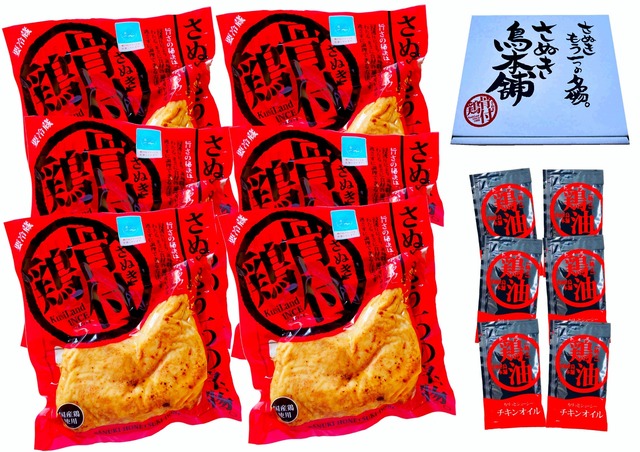 【さぬき鳥本舗】さぬき骨付鶏(若鶏)ファミリーセット さぬきの名物といえば『骨付鶏』! パッケージ内に、さぬき骨付鶏が6本と、鶏の旨みを閉じ込めたチキンオイルが6袋入った贈り物やお土産にピッタリのセットです。おいしく召し上がっていただくために、焼き方のしおりも入れております。 《さぬき骨付鶏(若鶏)》 味付けした骨付鶏を、鶏の旨みがたっぷり詰まったチキンオイルで焼き、真空パックしたさぬき骨付鶏。焼き立てを真空パックにすることで、鶏全体に味が染み込んでいます。 玉ねぎの甘さと、ピリッとスパイシーな唐辛子が絶妙です。辛すぎないので、辛いのが苦手な方や、お子様も安心してお召し上がりいただけます。 電子レンジで1分温めるだけで、簡単にお召し上がりいただけますが、さらにおいしくお召し上がりいただくには、付属のチキンオイルをたっぷりしいたフライパンで、もう一度焼くことで、表面はパリッと中はふっくらジューシーに仕上がります。(「2度焼き」の料理法) さぬき骨付鶏は化学調味料無添加です。 【セット内容】 骨付鶏240g✕6本※調理済み チキンオイル25g✕6袋 <お届けについて> ・本商品は、冷蔵でお届けします。 ・北海道、沖縄へのお届けの場合別途770円頂戴いたします。 ※ご注文後、3日~5日で発送いたします。 ※本商品は、取扱い上の都合により、他の商品との同梱発送ができません。そのため、商品数に応じて送料が必要となります。 ※熨斗をご希望の方は、備考欄にご記入ください。記入がない場合は、熨斗はお付けせず発送いたします。 ※商品の特性上お客様のご都合による返品・交換はお受けできません。 【名称】惣菜(焼物) 【原材料名】[骨鶏]鶏肉(国産)、シーズニングパウダー(食塩、胡椒、にんにく、玉ねぎ、とうがらし)、鶏油[チキンオイル]国産鶏油 【添加物】[骨付鷄]化学調味料無添加[チキンオイル]酸化防止剤(ビタミンE) 【内容量】[骨付鶏(240g)]×6本[チキンオイル(25g)]×6袋 【賞味期限】[骨付鶏]製造後、冷蔵で30日[チキンオイル]製造後、常温で180日 【骨付鶏製造者】有限会社さぬき鳥本舗/香川県三豊市高瀬町下勝間1253番地9 【骨付鶏製造所】有限会社さぬき鳥本舗/香川県観音寺市古川町63-1 【チキンオイル販売者】有限会社さぬき鳥本舗/香川県三豊市高瀬町下勝間1253-9 【チキンオイル加工所】サンキョーヒカリ株式会社/岐阜県各務原市須衛町3-339 【栄養成分表示】100gあたり 骨付鶏/熱量208kcal、たんぱく質21.2g、脂質13.2g、炭水化物1.1g、食塩相当量1.5g チキンオイル/熱量935kcal、たんぱく質0.1g、脂質99.3g、炭水化物0.0g、食塩相当量0.0g