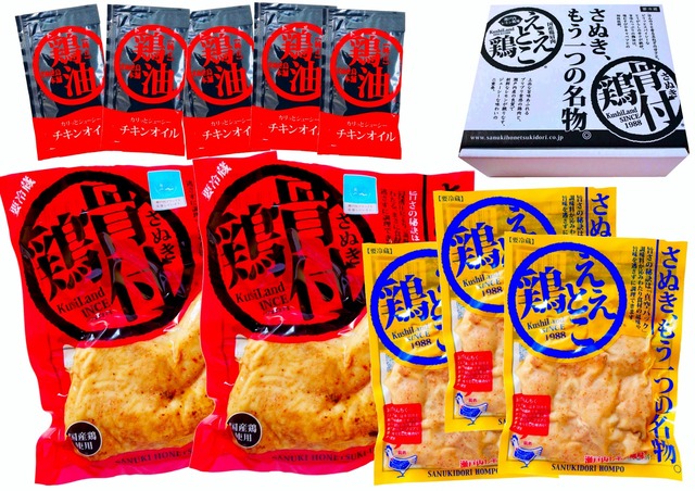 【さぬき鳥本舗】さぬき骨付鶏(若鶏)×2本・ええとこ鶏(国産鶏肉)×3袋ギフトセット さぬきの名物といえば『骨付鶏』! その骨付鶏が2本に、ええとこ鶏3袋、そして鶏の旨みを閉じ込めた純正チキンオイルが5袋ついたギフトセットです。 《さぬき骨付鶏(若鶏)》 味付けした骨付鶏を、鶏の旨みがたっぷり詰まったチキンオイルで焼き、真空パックしたさぬき骨付鶏。焼き立てを真空パックにすることで、鶏全体に味が染み込んでいます。 玉ねぎの甘さと、ピリッとスパイシーな唐辛子が絶妙です。辛すぎないので、辛いのが苦手な方や、お子様も安心してお召し上がりいただけます。 電子レンジで1分温めるだけで、簡単にお召し上がりいただけますが、さらにおいしくお召し上がりいただくには、付属のチキンオイルをたっぷりしいたフライパンで、もう一度焼くことで、表面はパリッと中はふっくらジューシーに仕上がります。(「2度焼き」の料理法) 《ええとこ鶏(国産鶏肉)》 上品な旨味あふれるプリプリ食感の鶏肉と、瀬戸内産の新鮮なレモンが織りなす、ジューシーな味わいの二重奏。 ええとこ鶏が3袋に、鶏の旨みを閉じ込めた純正チキンオイルが5袋ついた、お得なセットです。 さぬき骨付鶏・ええとこ鶏は化学調味料無添加です。 《セット内容》 骨付鶏(240g)×2本 ※調理済み ええとこ鶏(120g)×3袋 ※調理済み チキンオイル(25g)×5袋 <お届けについて> ・本商品は、冷蔵でお届けします。 ・北海道、沖縄へのお届けの場合別途770円頂戴いたします。 ※ご注文後、3日~5日で発送いたします。 ※本商品は、取扱い上の都合により、他の商品との同梱発送ができません。そのため、商品数に応じて送料が必要となります。 ※熨斗をご希望の方は、備考欄にご記入ください。記入がない場合は、熨斗はお付けせず発送いたします。 ※商品の特性上お客様のご都合による返品・交換はお受けできません。 【名称】惣菜(焼物) 【原材料名】[骨鶏]鶏肉(国産)、シーズニングパウダー(食塩、胡椒、にんにく、玉ねぎ、とうがらし)、鶏油[ええとこ鶏]鶏肉(国産)、シーズニングパウダー(食塩、胡椒、にんにく、玉ねぎ、とうがらし)、レモンパウダー、鶏油[チキンオイル]国産鶏油 【添加物】[骨付鷄・ええとこ鶏]化学調味料無添加[チキンオイル]酸化防止剤(ビタミンE) 【内容量】[骨付鶏(240g)]×2本[ええとこ鶏(120g)]×3袋 [チキンオイル(25g)]×5袋 【賞味期限】[骨付鶏]製造後、冷蔵で30日[ええとこ鶏]製造後、冷蔵で30日[チキンオイル]製造後、常温で180日 【骨付鶏・ええとこ鶏製造者】有限会社さぬき鳥本舗/香川県三豊市高瀬町下勝間1253番地9 【骨付鶏・ええとこ鶏製造所】有限会社さぬき鳥本舗/香川県観音寺市古川町63-1 【チキンオイル販売者】有限会社さぬき鳥本舗/香川県三豊市高瀬町下勝間1253-9 【チキンオイル加工所】サンキョーヒカリ株式会社/岐阜県各務原市須衛町3-339 【栄養成分表示】100gあたり 骨付鶏/熱量208kcal、たんぱく質21.2g、脂質13.2g、炭水化物1.1g、食塩相当量1.5g ええとこ鶏/熱量266kcal、たんぱく質21.8g、脂質19.0g、炭水化物1.9g、食塩相当量2.0g チキンオイル/熱量935kcal、たんぱく質0.1g、脂質99.3g、炭水化物0.0g、食塩相当量0.0g