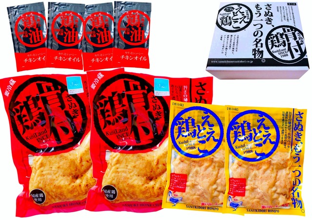 【さぬき鳥本舗】さぬき骨付鶏(若鶏)×2本・ええとこ鶏(国産鶏肉)×2袋ギフトセット さぬきの名物といえば『骨付鶏』! その骨付鶏が2本に、ええとこ鶏2袋、そして鶏の旨みを閉じ込めた純正チキンオイルが4袋ついたギフトセットです。 《さぬき骨付鶏(若鶏)》 味付けした骨付鶏を、鶏の旨みがたっぷり詰まったチキンオイルで焼き、真空パックしたさぬき骨付鶏。焼き立てを真空パックにすることで、鶏全体に味が染み込んでいます。 玉ねぎの甘さと、ピリッとスパイシーな唐辛子が絶妙です。辛すぎないので、辛いのが苦手な方や、お子様も安心してお召し上がりいただけます。 電子レンジで1分温めるだけで、簡単にお召し上がりいただけますが、さらにおいしくお召し上がりいただくには、付属のチキンオイルをたっぷりしいたフライパンで、もう一度焼くことで、表面はパリッと中はふっくらジューシーに仕上がります。(「2度焼き」の料理法) 《ええとこ鶏(国産鶏肉)》 上品な旨味あふれるプリプリ食感の鶏肉と、瀬戸内産の新鮮なレモンが織りなす、ジューシーな味わいの二重奏。 ええとこ鶏が2袋に、鶏の旨みを閉じ込めた純正チキンオイルが4袋ついた、お得なセットです。 さぬき骨付鶏・ええとこ鶏は化学調味料無添加です。 《セット内容》 骨付鶏(240g)×2本 ※調理済み ええとこ鶏(120g)×2袋 ※調理済み チキンオイル(25g)×4袋 <お届けについて> ・本商品は、冷蔵でお届けします。 ・北海道、沖縄へのお届けの場合別途770円頂戴いたします。 ※ご注文後、3日~5日で発送いたします。 ※本商品は、取扱い上の都合により、他の商品との同梱発送ができません。そのため、商品数に応じて送料が必要となります。 ※熨斗をご希望の方は、備考欄にご記入ください。記入がない場合は、熨斗はお付けせず発送いたします。 ※商品の特性上お客様のご都合による返品・交換はお受けできません。 【名称】惣菜(焼物) 【原材料名】[骨鶏]鶏肉(国産)、シーズニングパウダー(食塩、胡椒、にんにく、玉ねぎ、とうがらし)、鶏油[ええとこ鶏]鶏肉(国産)、シーズニングパウダー(食塩、胡椒、にんにく、玉ねぎ、とうがらし)、レモンパウダー、鶏油[チキンオイル]国産鶏油 【添加物】[骨付鷄・ええとこ鶏]化学調味料無添加[チキンオイル]酸化防止剤(ビタミンE) 【内容量】[骨付鶏(240g)]×2本[ええとこ鶏(120g)]×2袋 [チキンオイル(25g)]×4袋 【賞味期限】[骨付鶏]製造後、冷蔵で30日[ええとこ鶏]製造後、冷蔵で30日[チキンオイル]製造後、常温で180日 【骨付鶏・ええとこ鶏製造者】有限会社さぬき鳥本舗/香川県三豊市高瀬町下勝間1253番地9 【骨付鶏・ええとこ鶏製造所】有限会社さぬき鳥本舗/香川県観音寺市古川町63-1 【チキンオイル販売者】有限会社さぬき鳥本舗/香川県三豊市高瀬町下勝間1253-9 【チキンオイル加工所】サンキョーヒカリ株式会社/岐阜県各務原市須衛町3-339 【栄養成分表示】100gあたり 骨付鶏/熱量208kcal、たんぱく質21.2g、脂質13.2g、炭水化物1.1g、食塩相当量1.5g ええとこ鶏/熱量266kcal、たんぱく質21.8g、脂質19.0g、炭水化物1.9g、食塩相当量2.0g チキンオイル/熱量935kcal、たんぱく質0.1g、脂質99.3g、炭水化物0.0g、食塩相当量0.0g