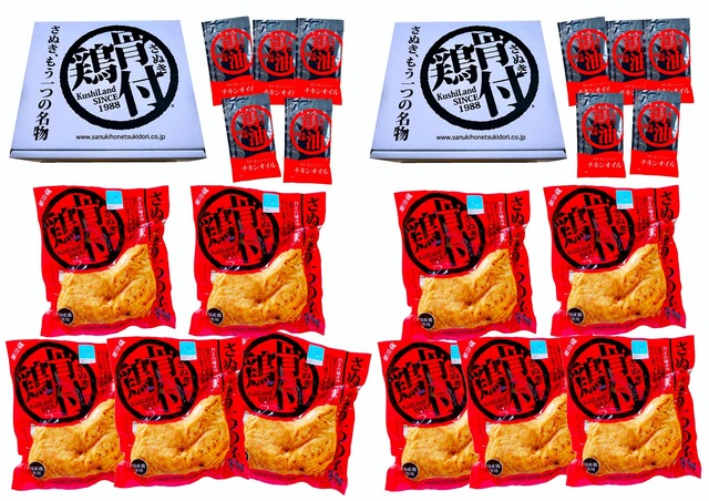 【さぬき鳥本舗】さぬき骨付鶏(若鶏)パーティーセット さぬきの名物といえば『骨付鶏』! パッケージ内に、さぬき骨付鶏が5本と、鶏の旨みを閉じ込めたチキンオイルが5袋が入ったセットが2箱で贈り物やお土産にピッタリです。おいしく召し上がっていただくために、焼き方のしおりも入れております。 《さぬき骨付鶏(若鶏)》 味付けした骨付鶏を、鶏の旨みがたっぷり詰まったチキンオイルで焼き、真空パックしたさぬき骨付鶏。焼き立てを真空パックにすることで、鶏全体に味が染み込んでいます。 玉ねぎの甘さと、ピリッとスパイシーな唐辛子が絶妙です。辛すぎないので、辛いのが苦手な方や、お子様も安心してお召し上がりいただけます。 電子レンジで1分温めるだけで、簡単にお召し上がりいただけますが、さらにおいしくお召し上がりいただくには、付属のチキンオイルをたっぷりしいたフライパンで、もう一度焼くことで、表面はパリッと中はふっくらジューシーに仕上がります。(「2度焼き」の料理法) さぬき骨付鶏は化学調味料無添加です。 【セット内容】 骨付鶏240g✕10本※調理済み チキンオイル25g✕10袋 <お届けについて> ・本商品は、冷蔵でお届けします。 ・北海道、沖縄へのお届けの場合別途770円頂戴いたします。 ※ご注文後、3日~5日で発送いたします。 ※本商品は、取扱い上の都合により、他の商品との同梱発送ができません。そのため、商品数に応じて送料が必要となります。 ※熨斗をご希望の方は、備考欄にご記入ください。記入がない場合は、熨斗はお付けせず発送いたします。 ※商品の特性上お客様のご都合による返品・交換はお受けできません。 【名称】惣菜(焼物) 【原材料名】[骨鶏]鶏肉(国産)、シーズニングパウダー(食塩、胡椒、にんにく、玉ねぎ、とうがらし)、鶏油[チキンオイル]国産鶏油 【添加物】[骨付鷄]化学調味料無添加[チキンオイル]酸化防止剤(ビタミンE) 【内容量】[骨付鶏(240g)]×10本[チキンオイル(25g)]×10袋 【賞味期限】[骨付鶏]製造後、冷蔵で30日[チキンオイル]製造後、常温で180日 【骨付鶏製造者】有限会社さぬき鳥本舗/香川県三豊市高瀬町下勝間1253番地9 【骨付鶏製造所】有限会社さぬき鳥本舗/香川県観音寺市古川町63-1 【チキンオイル販売者】有限会社さぬき鳥本舗/香川県三豊市高瀬町下勝間1253-9 【チキンオイル加工所】サンキョーヒカリ株式会社/岐阜県各務原市須衛町3-339 【栄養成分表示】100gあたり 骨付鶏/熱量208kcal、たんぱく質21.2g、脂質13.2g、炭水化物1.1g、食塩相当量1.5g チキンオイル/熱量935kcal、たんぱく質0.1g、脂質99.3g、炭水化物0.0g、食塩相当量0.0g