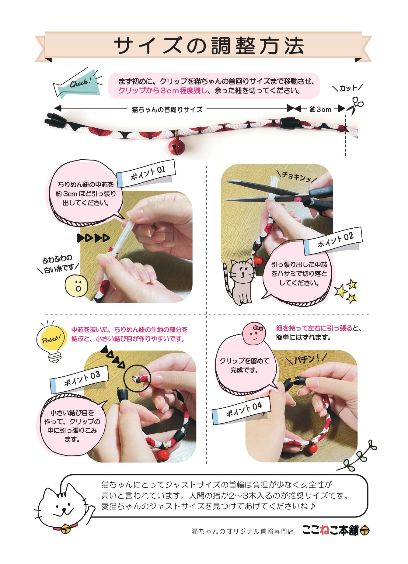 ・全猫ちゃん対応サイズ(〜30cmまで)飼い主様ご自身で、愛猫ちゃんの首回りに合わせてジャストサイズに調整してあげられます。