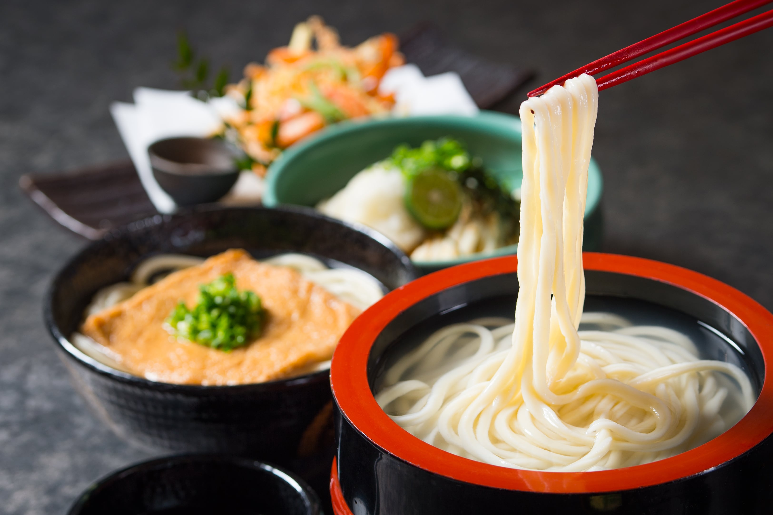 めんは九州・福岡産小麦をメインに使用。天然素材ベースの「だし」で仕上げた2種類のつゆと、ジューシーな大判の「きつね」、小えびと野菜の「かきあげ」、やくみの「天かす」入りです。