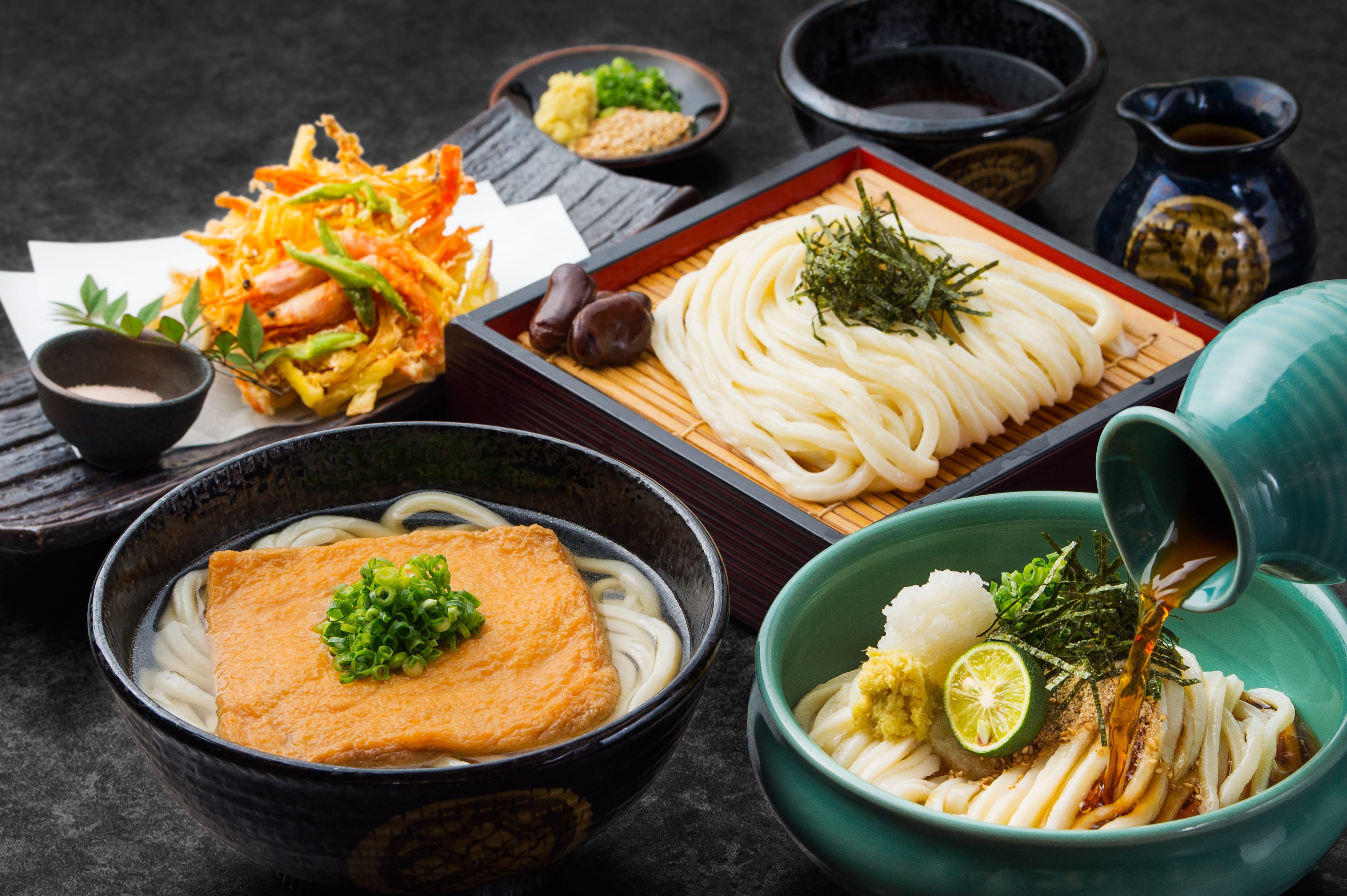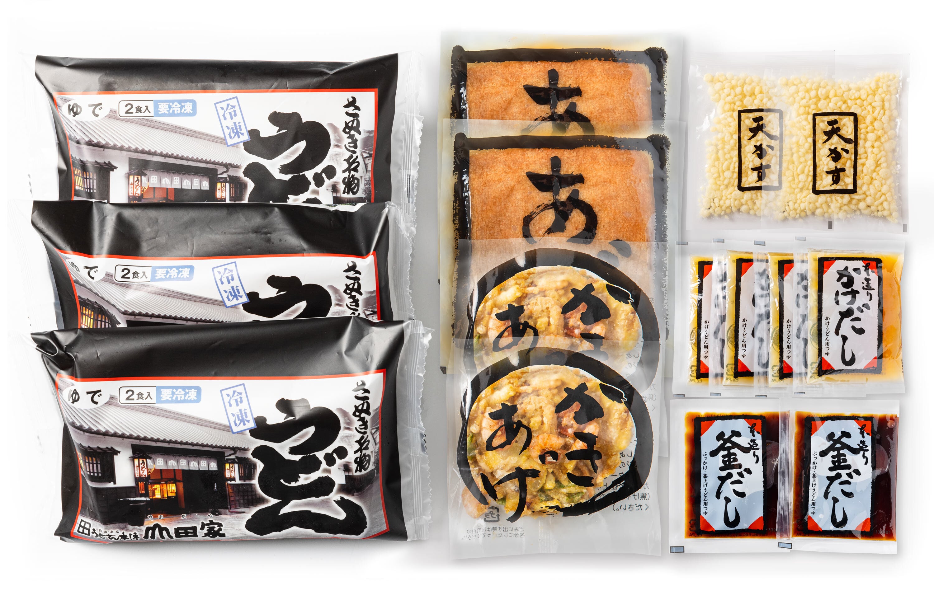 ぶっかけ・釜あげ(ざる)・かきあげ・きつね、四つの味が楽しめる山田家一押しの贅沢な詰め合わせです。